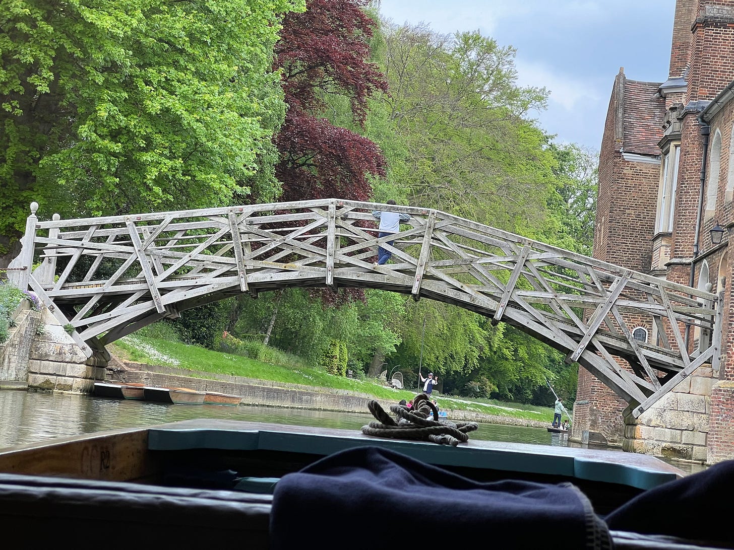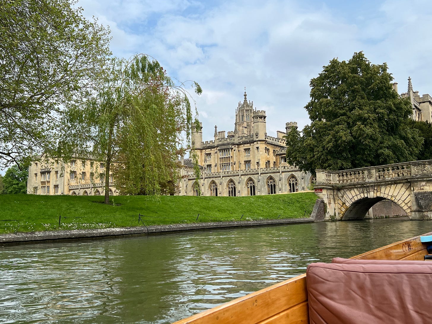 Ne otiemur. I admire anyone who, having taken on a responsibility, insists on prosecuting it faithfully to the end, no matter what obstacles arise in the path. My son and I went out in a punt on the Cam a few days ago. This is different from saying that we went punting, as that might imply that one of us actually stood on the bridge at the rear—in the style Cantabrigian rather than Oxonian—plying the pole and trying to keep his balance; rather, we hired a punt from a tour-agency. We even hired it for a private tour, as there’s actually no pleasure in being crowded into a punt alongside a dozen other passengers; but we didn’t pay the price initially asked. The company claimed on its poster that a private tour would cost £400. When I said that this was too much, the price instantly dropped to £100 (off-hours, you see, or something like that). Even this felt a little exorbitant, but it seemed to me that, having secured a 75% reduction of the fare in roughly six seconds, I was morally obliged to stop there. It was a beautiful spring morning, after all, and this was really the only way we were going to see the college backs at close range while in town; more to the point, I was resolved to give my son the “Cambridge experience” in all its languid glory. So off we glided atop the glassy waves (murkily glassy, of course, but still sufficiently hyaloid to induce a bit of poetical revery in me).